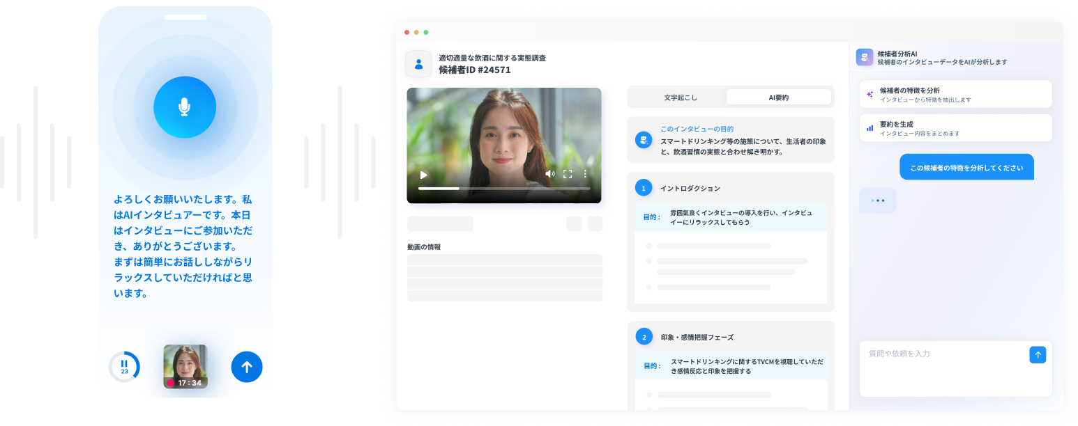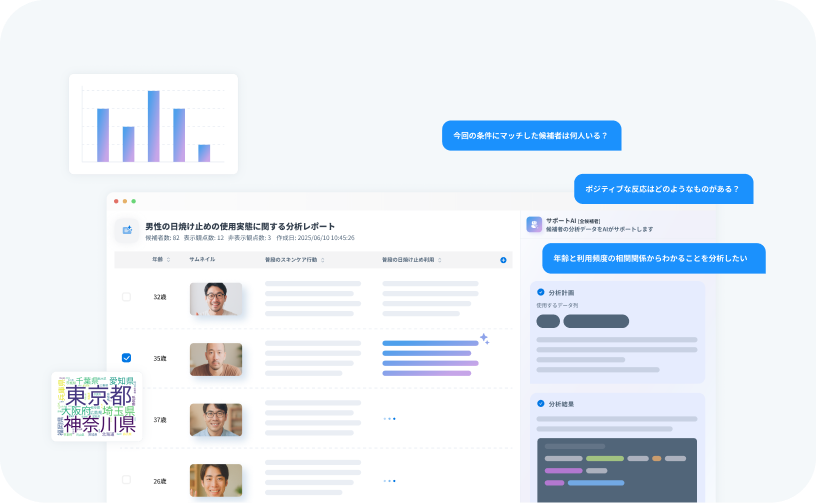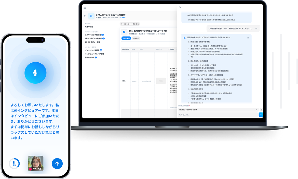 熟練リサーチャーによる調査はもちろん、独自開発の生成AIによる自動インタビューなどローコストかつ迅速にあらゆる定性データを集めることが可能です。海外インタビュー調査において24時間で30サンプル回収した例など、柔軟な調査を提供します。