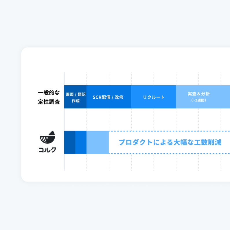 プロダクト(コルクインタビュー)のAI分析機能等をはじめ、すべてのプロセスを徹底的に時間短縮。結果までの速さを追求し、迅速かつ高品質な調査を設計からレポーティングまで一気通貫でご支援します。